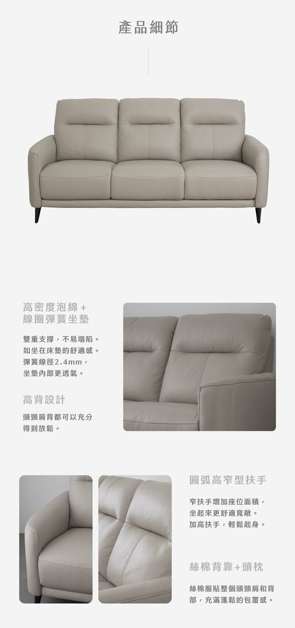 ・ 紓壓高背與寬敞座位!完美包覆頭頸肩背,搭配圓弧高窄型扶手,大幅增加座位面積與舒適度。