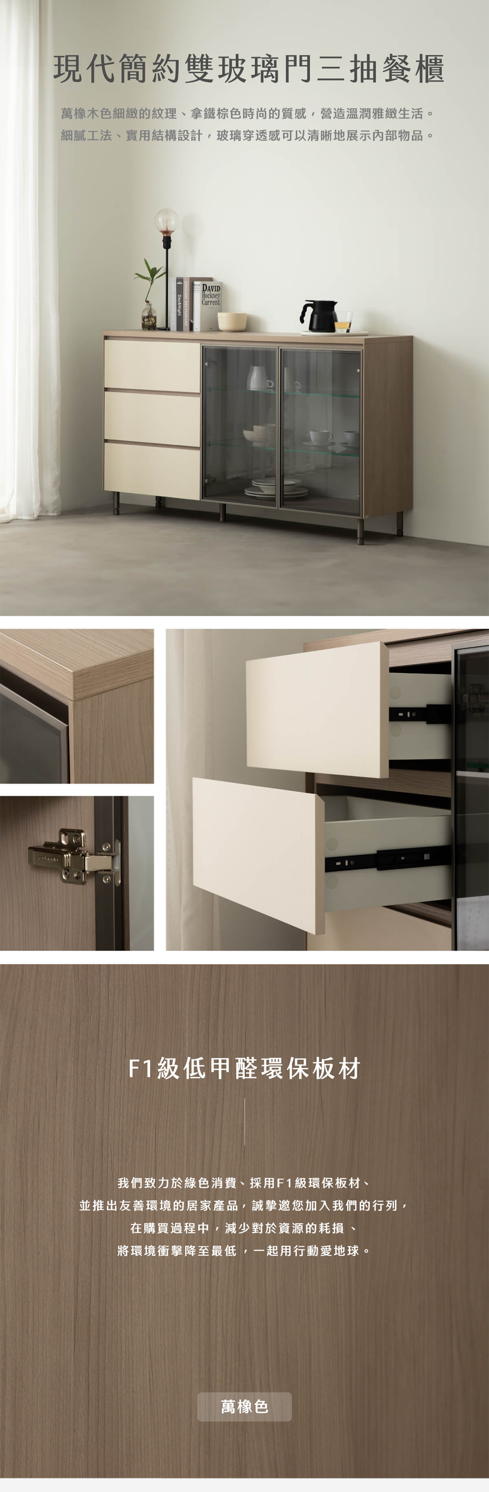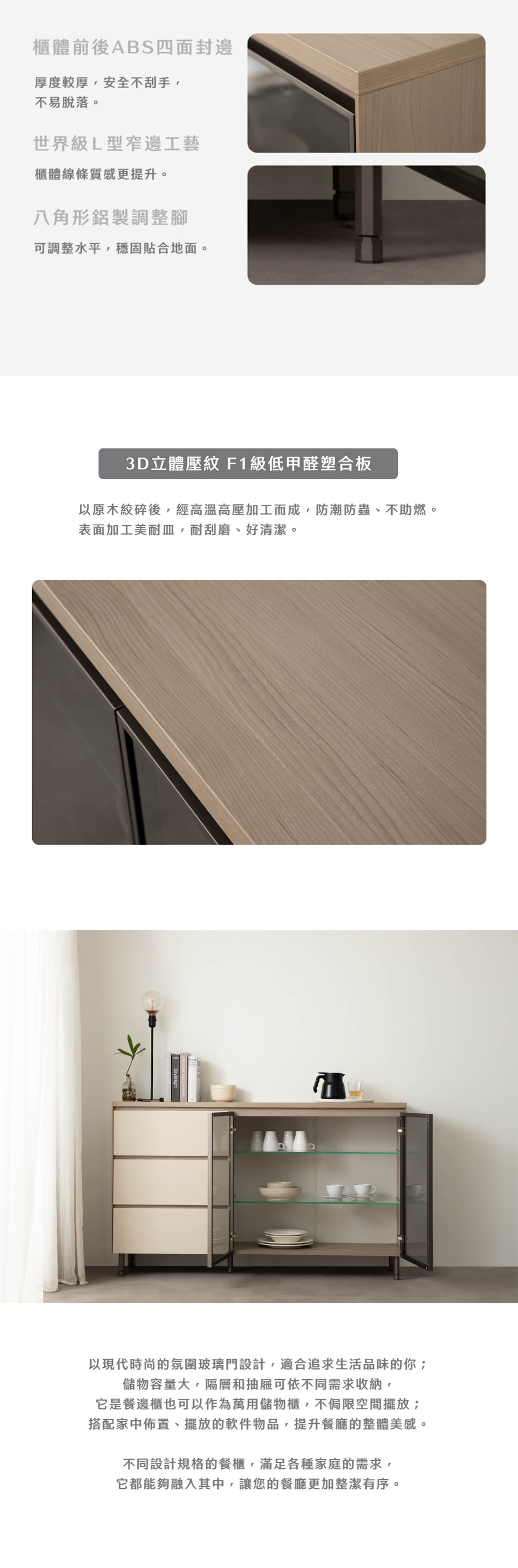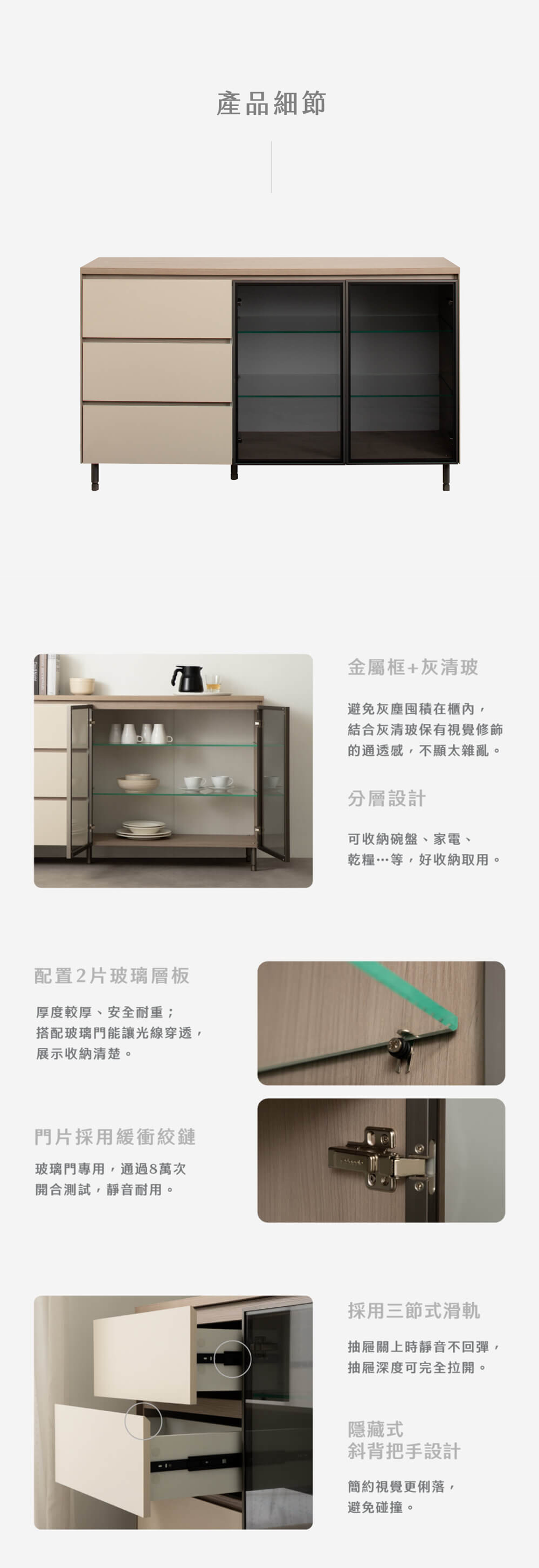 ・ 150cm實用面寬與透視收納!結合灰清玻璃雙門與實用三抽屜,輕鬆分區收納碗盤家電,通透不顯雜亂。