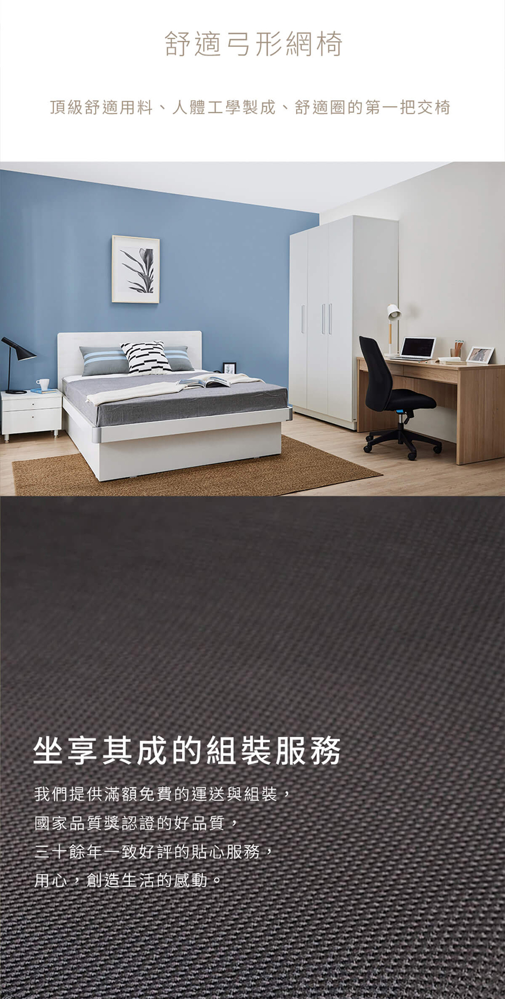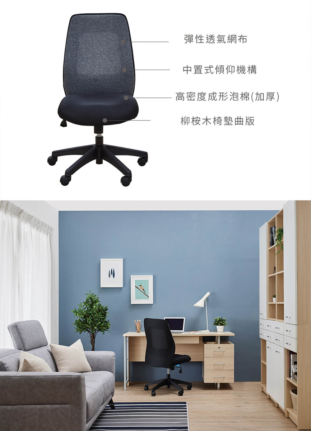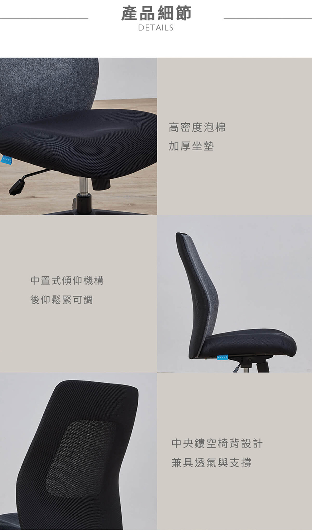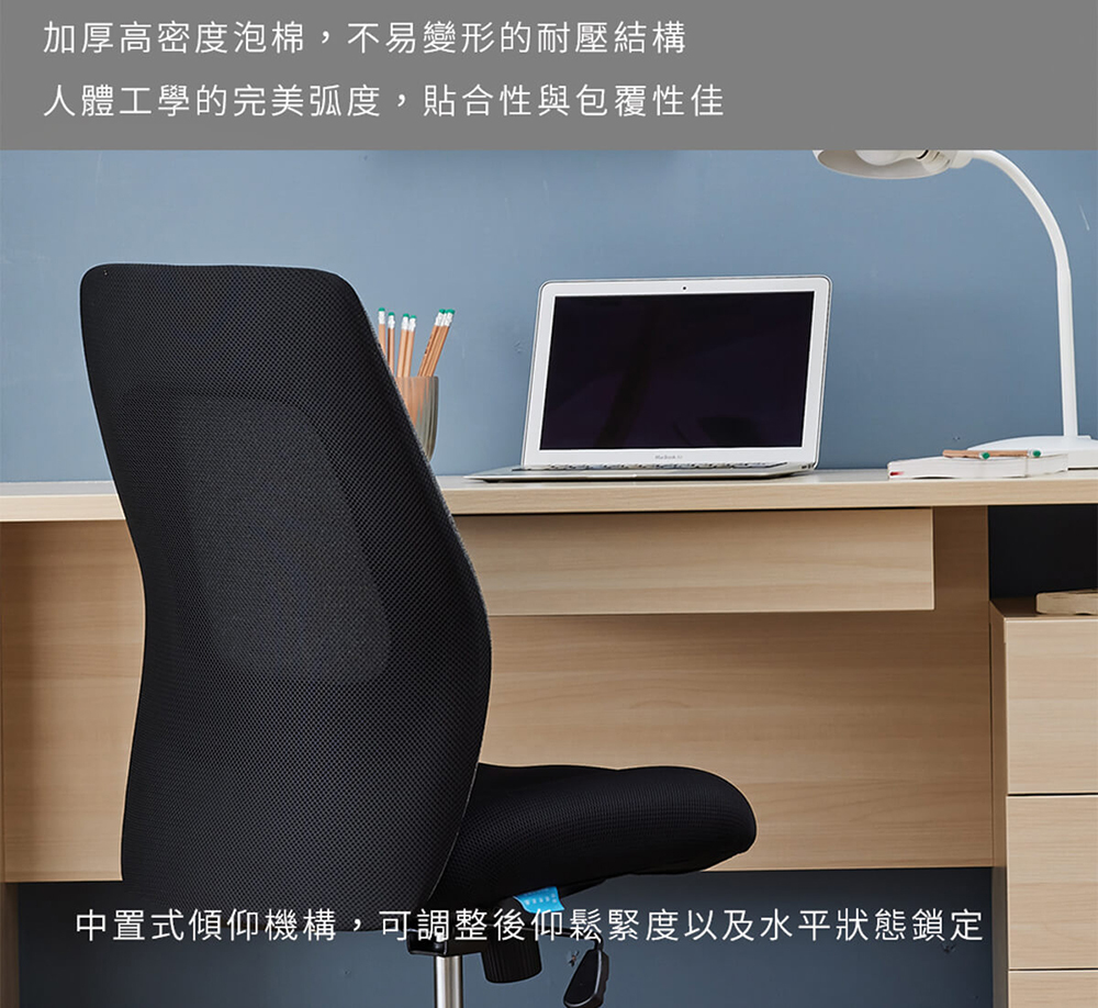 • 透氣網布椅背:高彈力網布設計,長效散熱且不悶,維持背部乾爽舒適。