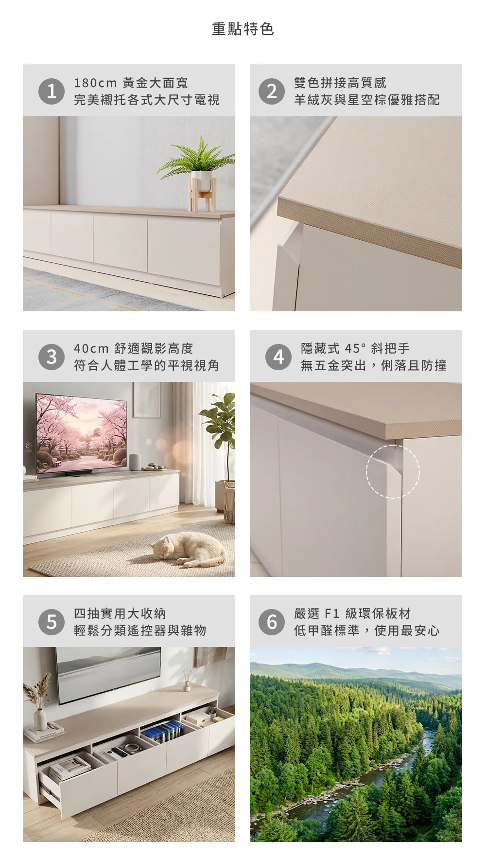 ・ 180cm黃金大面寬!完美襯托大尺寸電視,40cm高度帶來最符合人體工學的舒適觀影視角。