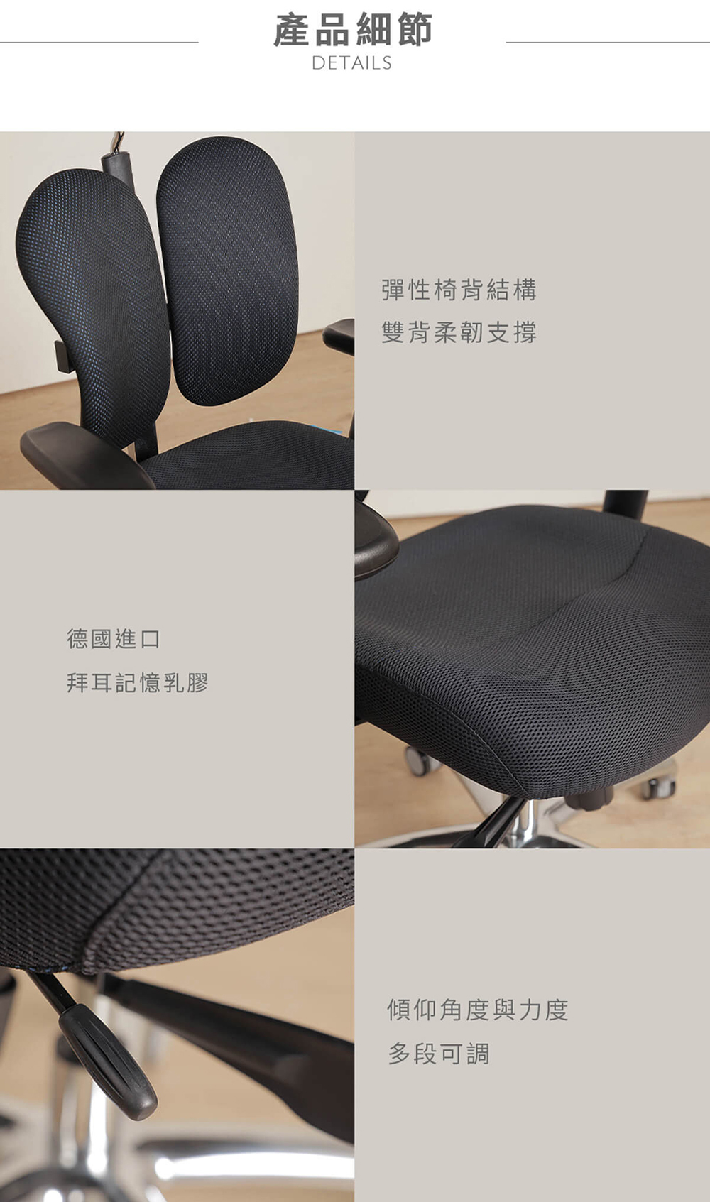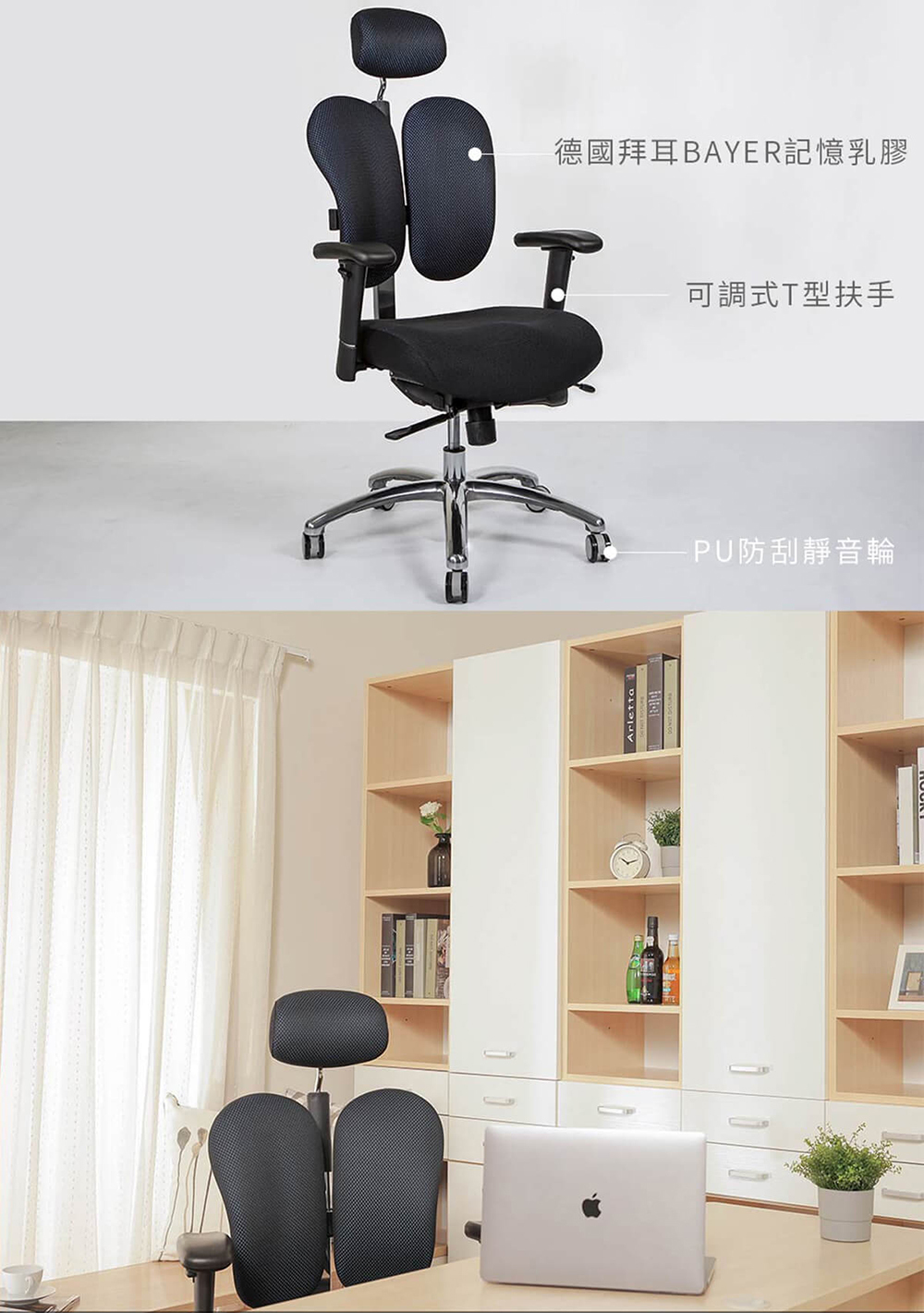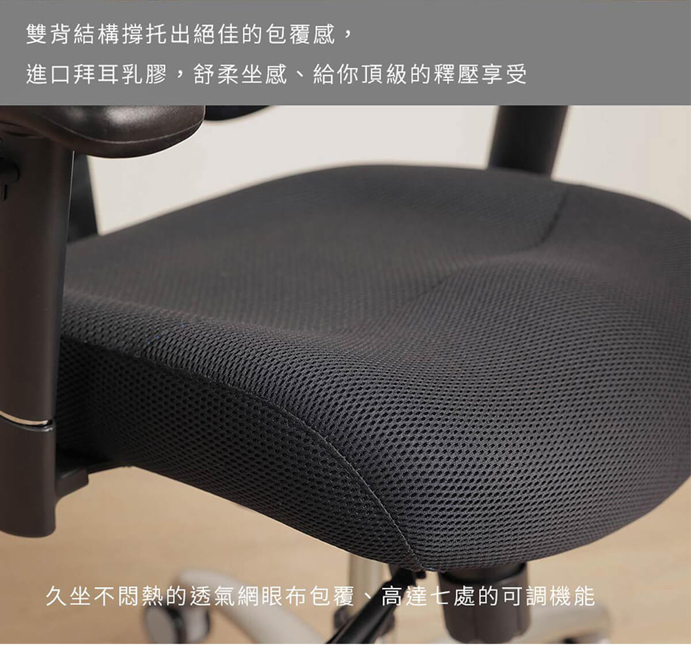 高機能雙背人體工學設計,結合動態支撐與多段調整,打造全方位舒壓的頂級坐感體驗!