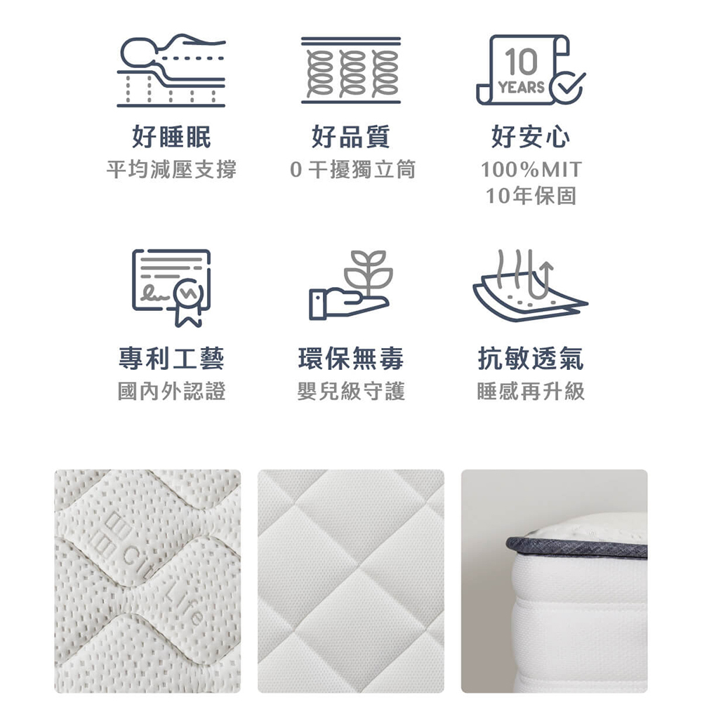 機能型睡眠設計,結合德國專利與台灣製造,打造透氣、支撐兼具的舒適床墊。