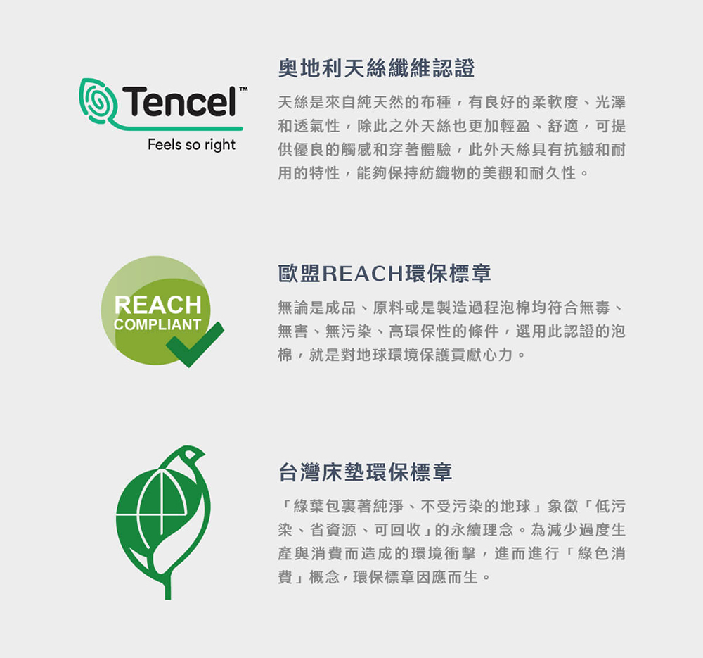 ・環保雙認證:台灣環保標章+歐盟REACH。