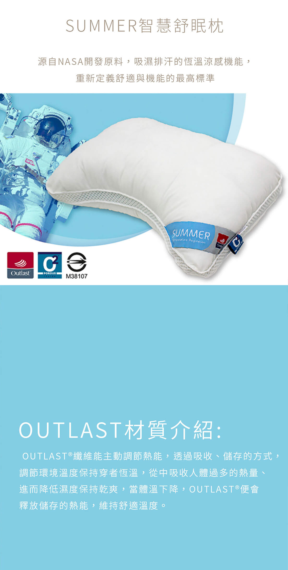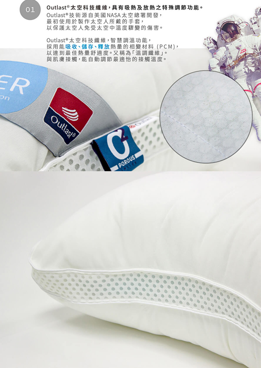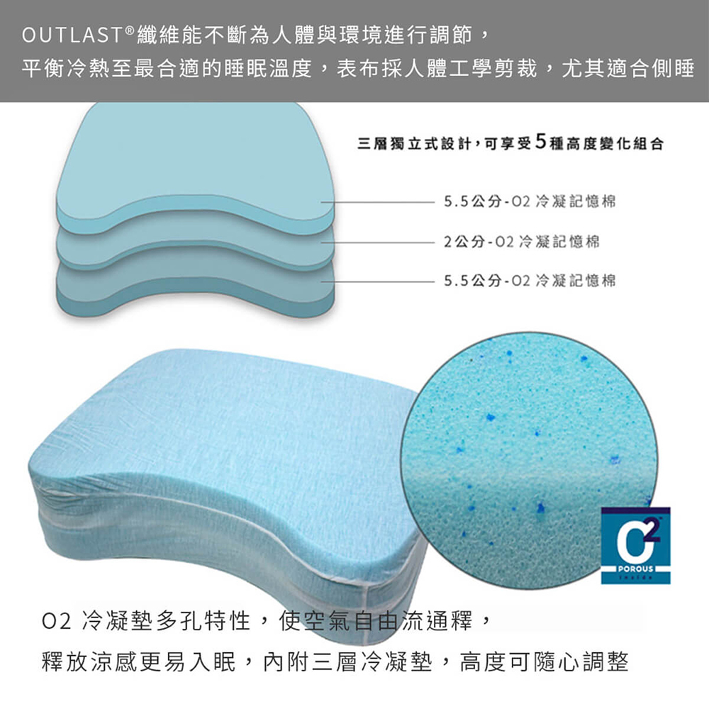 • 智慧恆溫核心:主動調節頭部溫度,平衡熱能變化,減少悶熱與半夜醒來的不適。